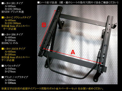 シートメーカーによる仕様変更等が有る為、装着されるシートの装着寸法/形状/使用ボルトは各シートメーカーにお問い合わせ頂くか、シートをご確認ください。